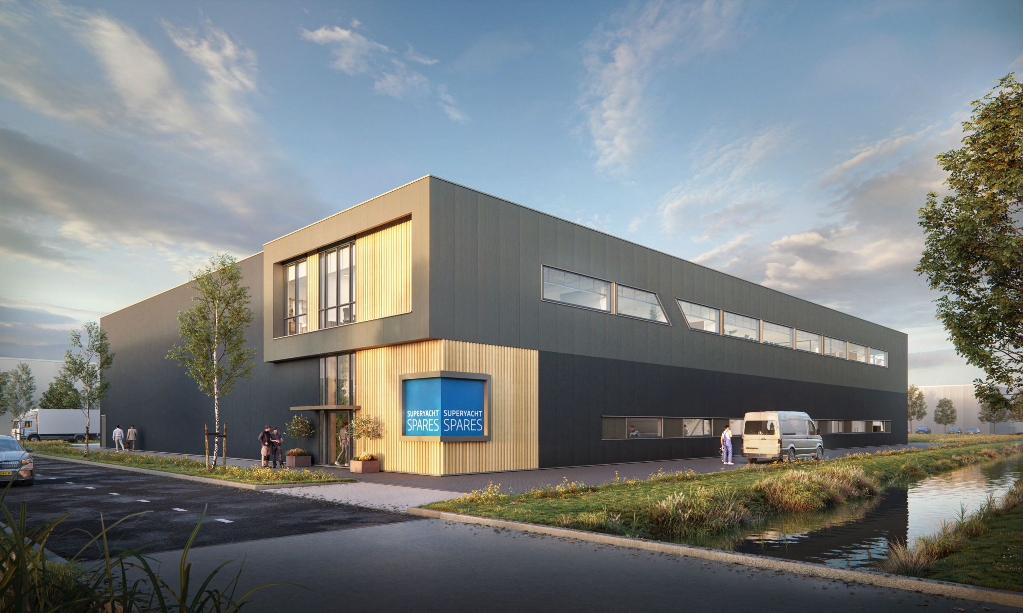 Een nieuw pand voor SuperYacht Spares bestaande uit een bedrijfsruimte van 2.200 m² met laaddock en een kantoorruimte van 800 m². De omgevingsvergunning is verleend en we zijn begonnen met de heiwerkzaamheden.